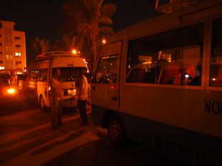 翌日の朝になり3:30にアブシンベル神殿へに向かうツアーバスが出発した。国境にも近いためか何台ものツアーバスを1箇所に集め、軍の護衛車に先導される形で、皆連なって約4時間かけてアブシンベルに向かう。